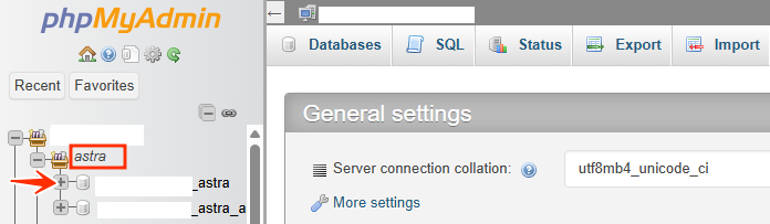 در سمت چپ phpMyAdmin لیست دیتابیسها را میبینید. دیتابیس مربوط به سایت وردپرسی خود را انتخاب کنید.