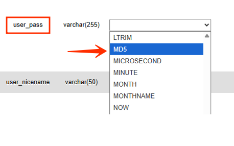 در بخش Function گزینه MD5 را انتخاب کنید تا رمز جدید بهصورت رمزنگاری ذخیره شود.