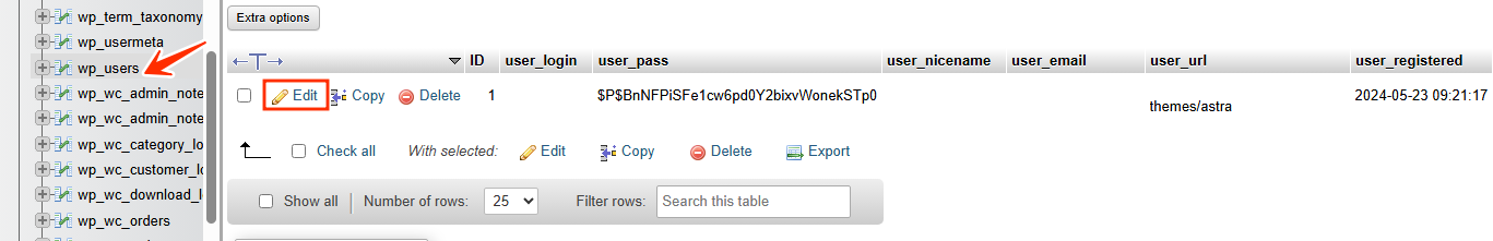 از بین جدولهای موجود، جدول wp_users را باز کنید.
