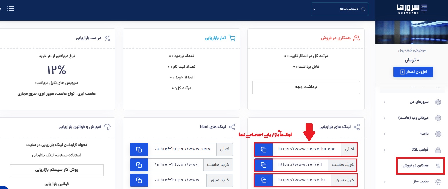 اگر در سیستم همکاری در فروش سرورها ثبت‌نام کرده‌اید، با قراردادن لینک بازاریابی اختصاصی خود در سایت یا شبکه‌های اجتماعی می‌توانید به‌راحتی کسب درآمد کنید.