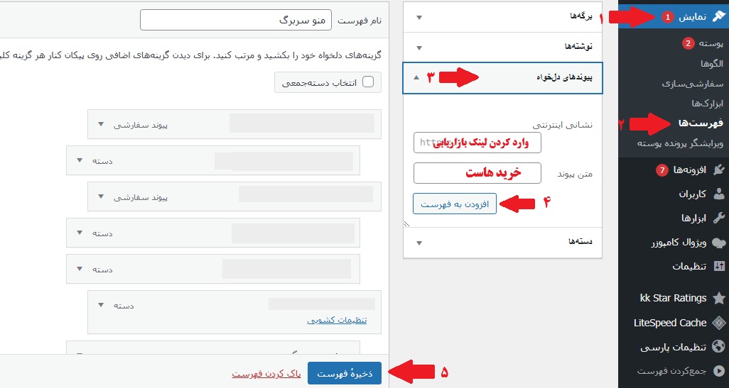 برای اضافه کردن لینک بازاریابی در منوی بالای سایت وردپرسی، ابتدا وارد پیشخوان وردپرس شوید و به مسیر نمایش → فهرست‌ها (Menus) بروید. سپس روی گزینه پیوند دلخواه (Custom Link) کلیک کنید.