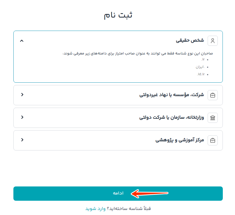 انتخاب نادرست نوع شناسه کاربری میتواند باعث رد درخواست ثبت دامنه از سوی ایرنیک شود؛ بنابراین حتماً هنگام ثبتنام، گزینه متناسب با شرایط خود را با دقت انتخاب کنید.