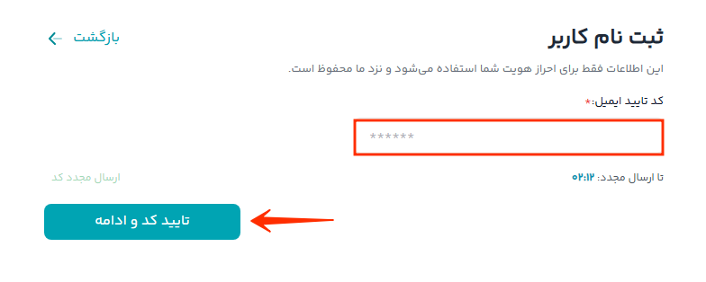 در مرحله بعدی کد تأیید ارسال شده به ایمیل را طبق تصویر وارد کنید.
