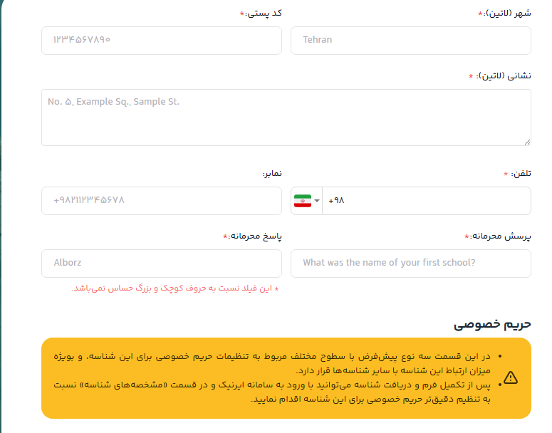 اگر تا اینجا مراحل احراز هویت را با موفقیت پشت سر گذاشتید، وارد مرحله ثبتنام میشوید.در این بخش باید اطلاعات هویتی و تماس را وارد کنید و روی گزینه «بازنگری» کلیک نمایید.