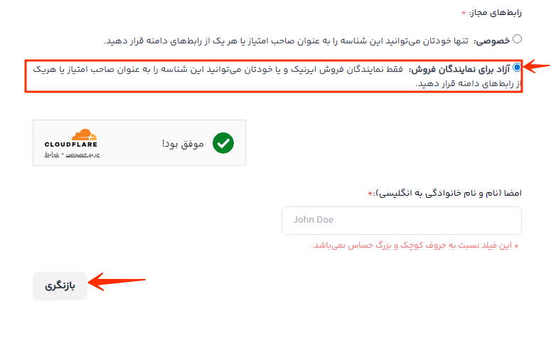 نکته ۱: سطح دسترسی را روی «آزاد برای نمایندگان فروش» قرار دهید تا شرکتهای هاستینگ بتوانند دامنه را برای شما ثبت کنند.