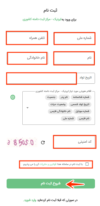 چنانچه قبلاً در این سامانه یا سامانههای مشابه ثبتنام کردهاید، کافی است کد ملی خود را وارد کرده، کد امنیتی را تکمیل و سپس روی تأیید و ادامه کلیک کنید.