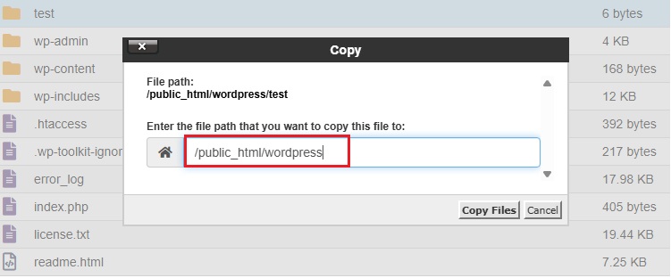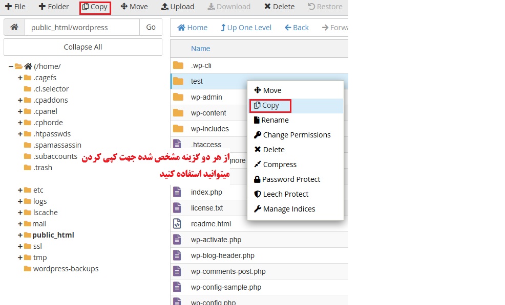 با این کار، فایل wp-config.php در مسیر جدید /public_html/backup/ کپی می‌شود و نسخه اصلی آن همچنان در مسیر /public_html/wordpress/ باقی می‌ماند.