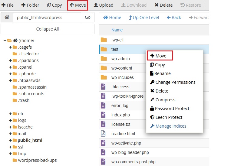با این کار، فایل از مسیر /public_html/wordpress/ به مسیر /public_html/backup/ منتقل می‌شود و در مسیر اولیه دیگر وجود ندارد.